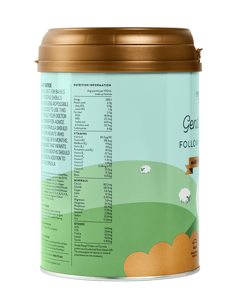 Gentle Sheep® Premium Follow-On Formula is specially formulated to meet the increasing nutritional requirements of babies from 6 to 12 months and intended to complement the introduction of solids. This nutritionally balanced formulation provides key nutrients tailored to the needs of growing infants 6 months or older.